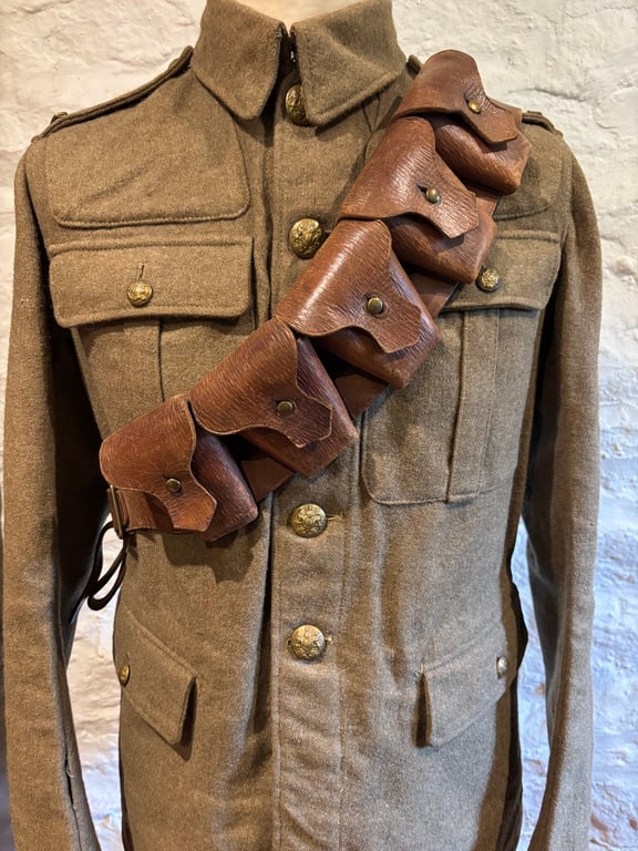 Although a commonly found item on the market this example of the 1903 Equipment Bandolier is in very good condition with the added interest of a soldiers service number,18554 inscribed to the inside. No cracks to the leather which remains supple throughout. Faint but undecipherable makers name impressed to one end of the strap 71 soldiers served under this number and went overseas.