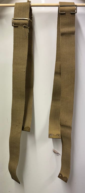 A matched pair of 1908 web equipment second issue braces by MWS both dated 1918. One has some fraying to the edge which would be obscured on a mannequin display. Both are near un-issued with no blanco. See also the 1918 waist belt by the same maker.