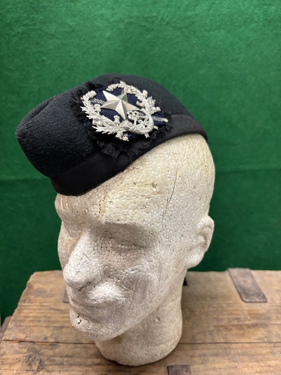 A very good used condition Scottish Rifles glengarry. Silk rosette with a piece of tartan behind the badge. The badge itself is a finely struck white metal example. The tails remain. No internal markings