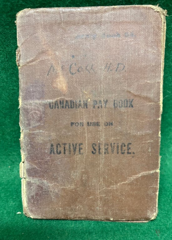 A well filled out CEF paybook to Canadian Born 755156 Private H D McColl 52nd Battalion CEF. He was wounded ( gun shot wound left leg severe)on 4/5th April 1917 his papers state at Vimy Ridge. Evacuated to England he did not return to France before the Armistice. He was attached to the Canadian Machine Gun Corps Reinforcement battalion in 1918. Sold with copy of his CEF discharge certificate showing entitlement to 1 gold stripe.