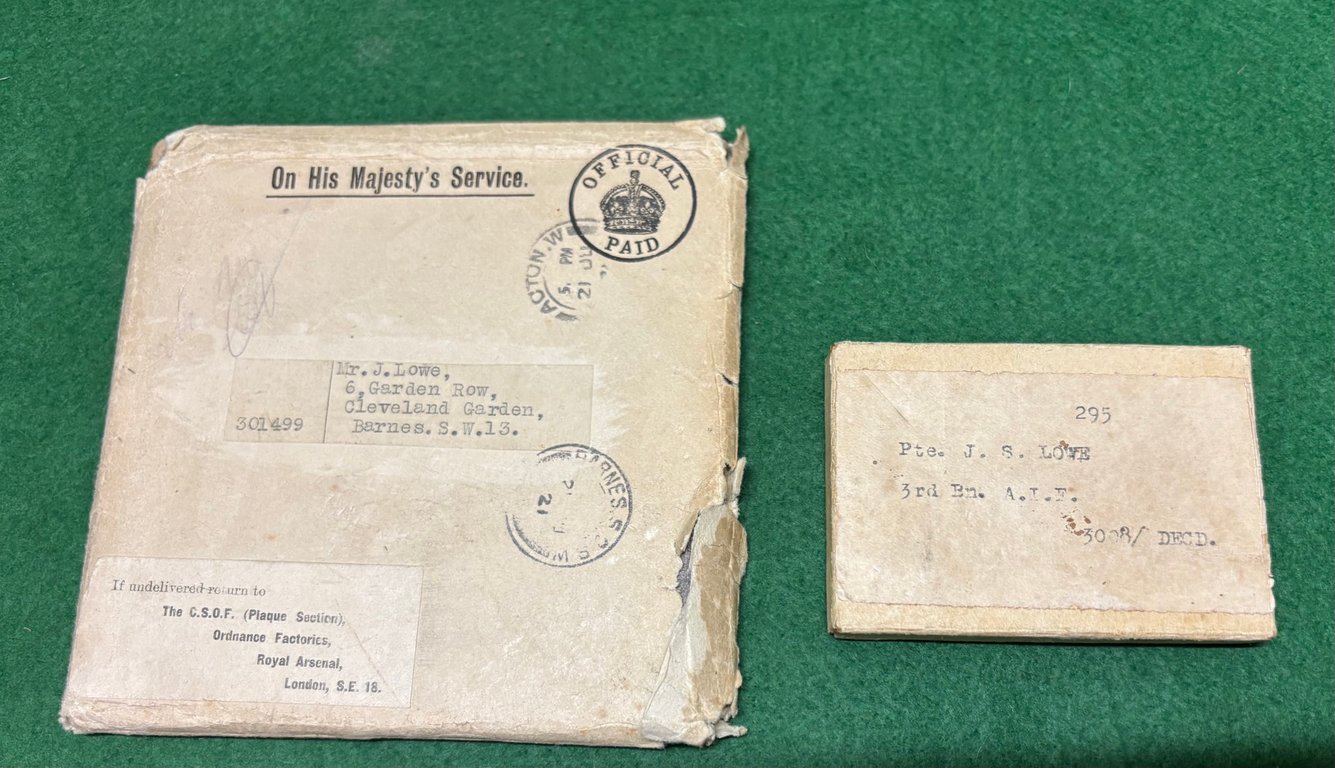 AIF 1st Contingent casualty 295 Pte J S Lowe 3rd Battalion AIF Memorial Plaque, Cover, British War Medal in its box of issue with accompanying letter sent to his father. John Lowe died of pneumonia on 9th November 1914 en route to Egypt . He was buried at sea. This group represents his full entitlement.