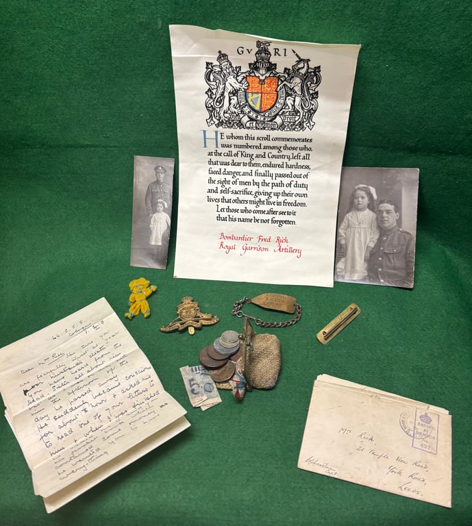 A very poignant group associated with 126790 Bombardier Fred Rich RGA. Fred survived two years at the front and being wounded only to die of the Spanish Flu on 5th April 1919. The group consists of his Memorial Scroll with accompanying certificate. Identity bracelet in the shape of a shell, his wound stripe and cap badge. There are four letters three sent by a sister who nursed him from admission to hospital to his death. In one of the letters the sister refers to a purse of money she returned to his wife. This little purse is included with the group it contains mixed British and German coins and notes. There is a condolence letter from his Battery Commander and two photos of Fred with his daughter. Finally a small doll made of wool possibly a gift from his daughter. There are other associated official documents sent to his wife.