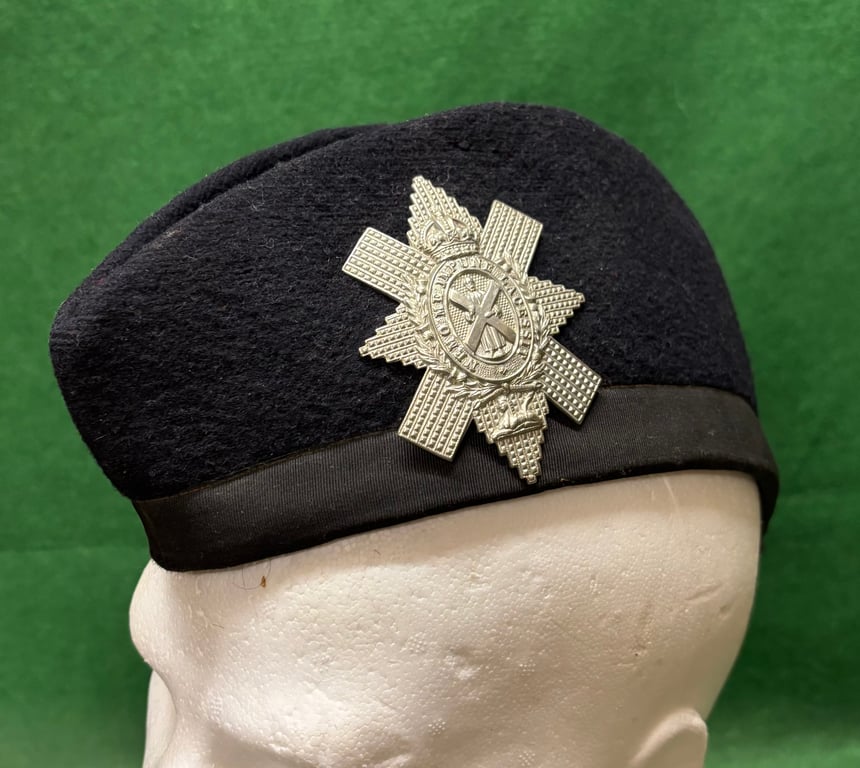 A genuine WW1 Black Watch Glengarry. This example with silk band, glazed cotton lining and paper size label. Silk bands were a feature of pre WW1 glengarrys preceeding the calfskin. They were reintroduced in late WW1. Ghosting of the badge confirms this to be Black Watch. Tails absent.