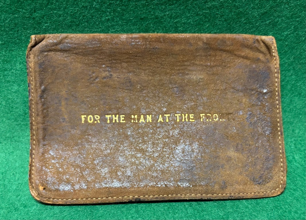 A well used example of one of the many commercial items aimed at the families and sweethearts of soldiers on active service. This is a service used example that retains 80% of it gold leaf imprinted title.