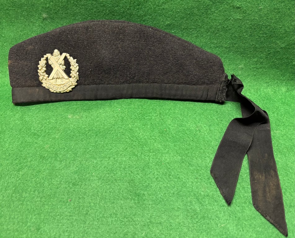 A good field worn condition Cameron Highlanders Glengarry. All blue wool body with red tourie. The band is silk and to the interior the correct number over WD over letter stamp (now faded). Tails present but separating. The badge original to the glengarry.