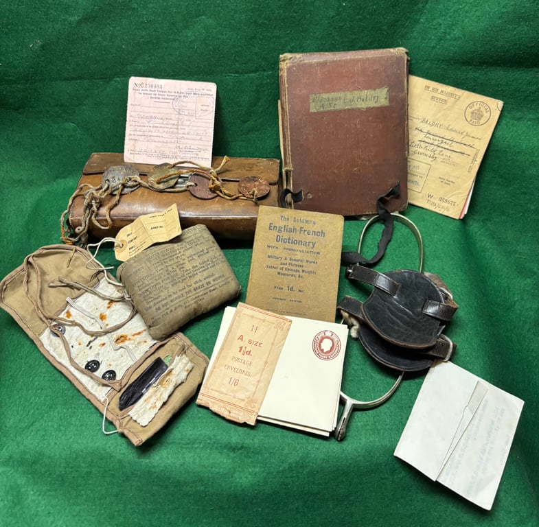 A superb time capsule of items all pertaining to S/308846 Private EJ Baldry ASC Supply (originally ASC Transport transferred in July 1918) and contained in his Other Services 1917 dated haversack. Items include two pairs of identity discs, his spurs, his 1918 First Field Dressing, his leather personal grooming kit marked EJ B to the flap, sewing kit, parts II & III of ASC Training these full of information and illustrations part III still has its 4 grasses and seeds plates almost always missing, His issue note book well filled in with supply and rationing information, blank active service envelopes and field service message cards. Hi WW2 AB 64. He re enlisted in WW2 and served at home from 1940 to 1944 so in addition to his British War and Victory Medals ( not present) he would have been entitled to the WW2 Defence and War Medals. A large group photo in which I am sure he appears but is unidentified. The haversack has had its internal divider removed but otherwise in good service used condition. This group is as I bought it with nothing added to 'embellish' it.