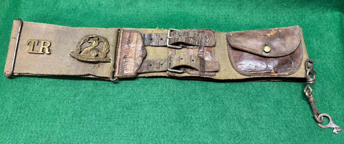 A canvas and leather belt adorned with various cap badges and shoulder titles named 'Pte Boyden' These belts were very popular with Tommies who collected cap badges buttons and often enemy insignia fixing them to various privately bought or unit made belts. This example has a jack knife clip added. The last picture shows these type of belts being worn.