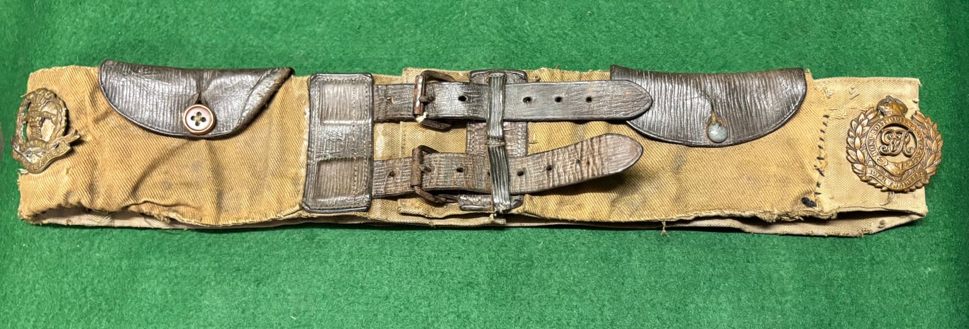A canvas and leather belt adorned with various cap badges and shoulder titles named These belts were very popular with Tommies who collected cap badges buttons and often enemy insignia fixing them to various privately bought or unit made belts. The last picture shows these type of belts being worn.